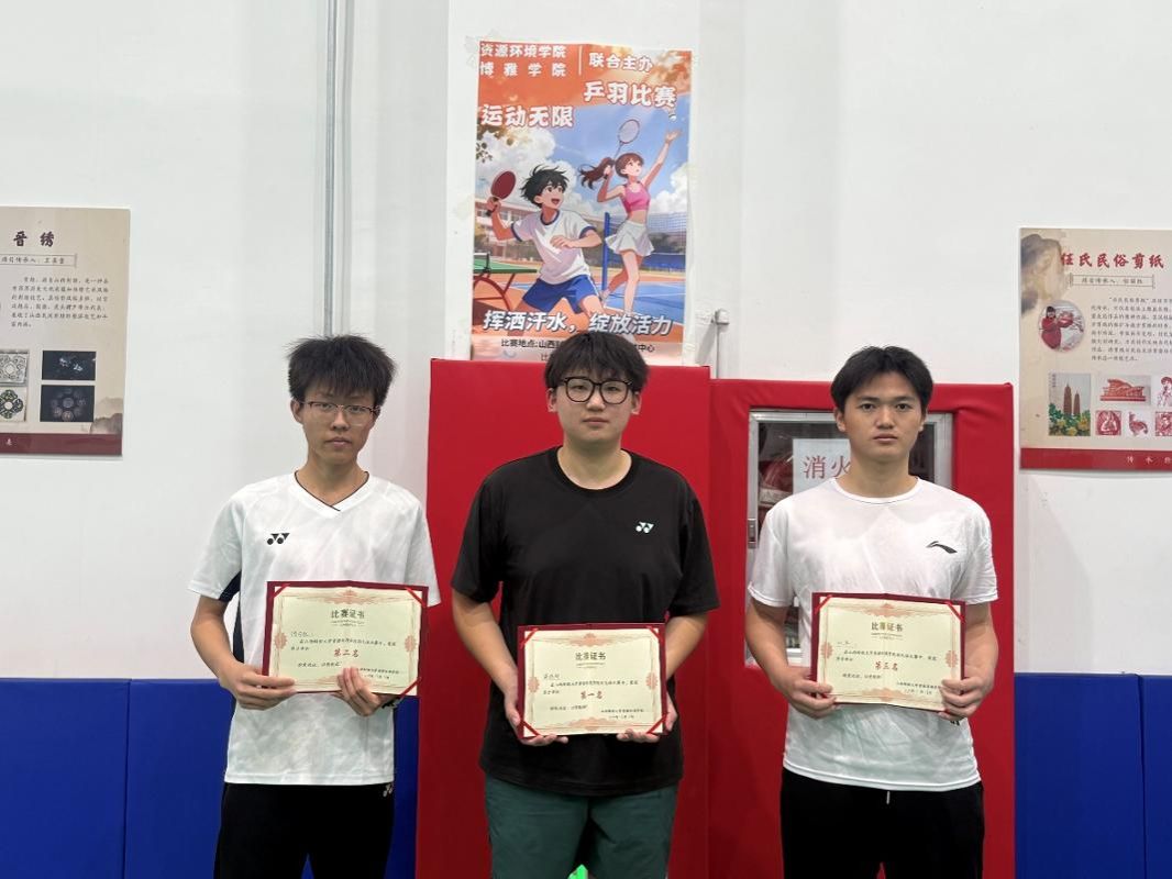 为丰富新生文化生活,增强学子身体素质,弘扬拼搏进取的体育精神,2025年11月16日,由资源环境学院和博雅学院共同举办的“羽动青春,乒出风采”羽毛球暨乒乓球比赛在迎泽校区文体中心圆满落幕。本次赛事吸引了新生踊跃报名参赛,分为羽毛球男子单打、女子单打及乒乓球男单三个项目,为热爱球类运动的学子交流竞技搭建了一个优质的平台。