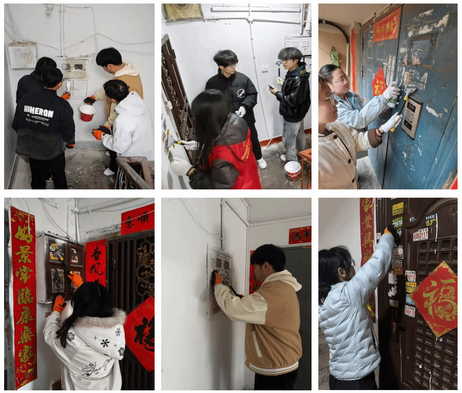 活动现场,志愿者们手持铲刀、水桶、涂料等工具,分工协作、干劲十足。在社区工作人员的统一安排下,大家深入居民楼,对楼道、电表箱、单元门等区域的“牛皮癣”小广告展开集中清理。面对粘性强、难清除的广告贴纸,志愿者们耐心细致地用铲刀逐一铲除;对于顽固残留的印记,则通过涂料粉刷进行覆盖,使墙面恢复原本的整洁面貌。值得一提的是,志愿者们在清理过程中充分发挥专业优势,注重环保材料的使用,严格把控施工细节,在高效完成清理任务的同时,最大限度保护社区公共设施,以实际行动诠释了资源环境学院在生态保护与人居环境整治方面的专业特色。